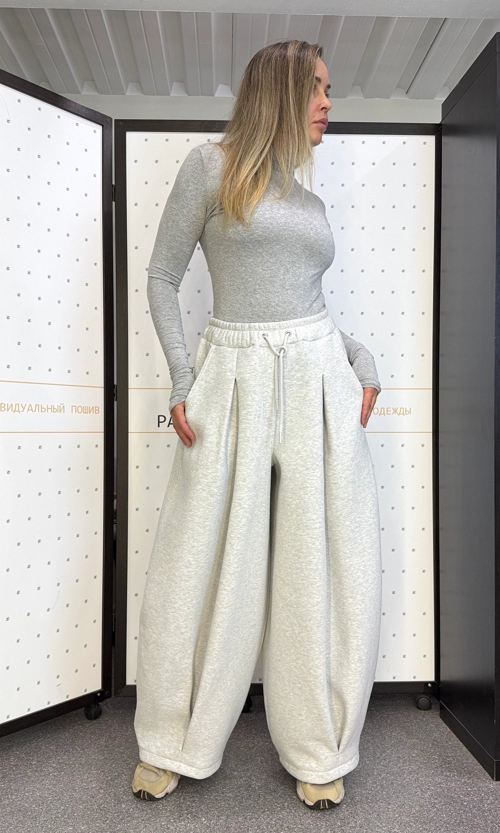 Крой свободный, объёмный в области бёдер, с заужением к щиколотке. Посадка по