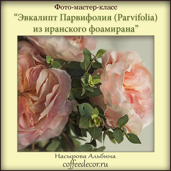 90В мастер-классе описаны приёмы и этапы создания веточки мелколистного эвкалипта Парвифолия (Parvofolia) с изумрудными листиками с сизым налетом из иранского фоамирана.