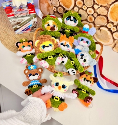 Формат пдф в закрытой группе. В мк входит описание игрушек: - зайка - сова - тигр - мишка - лев - белка - панда - лиса - хаски - кот Полностью цельновязаные, размер 12 см, пришиваем ушки у зайки и берет.