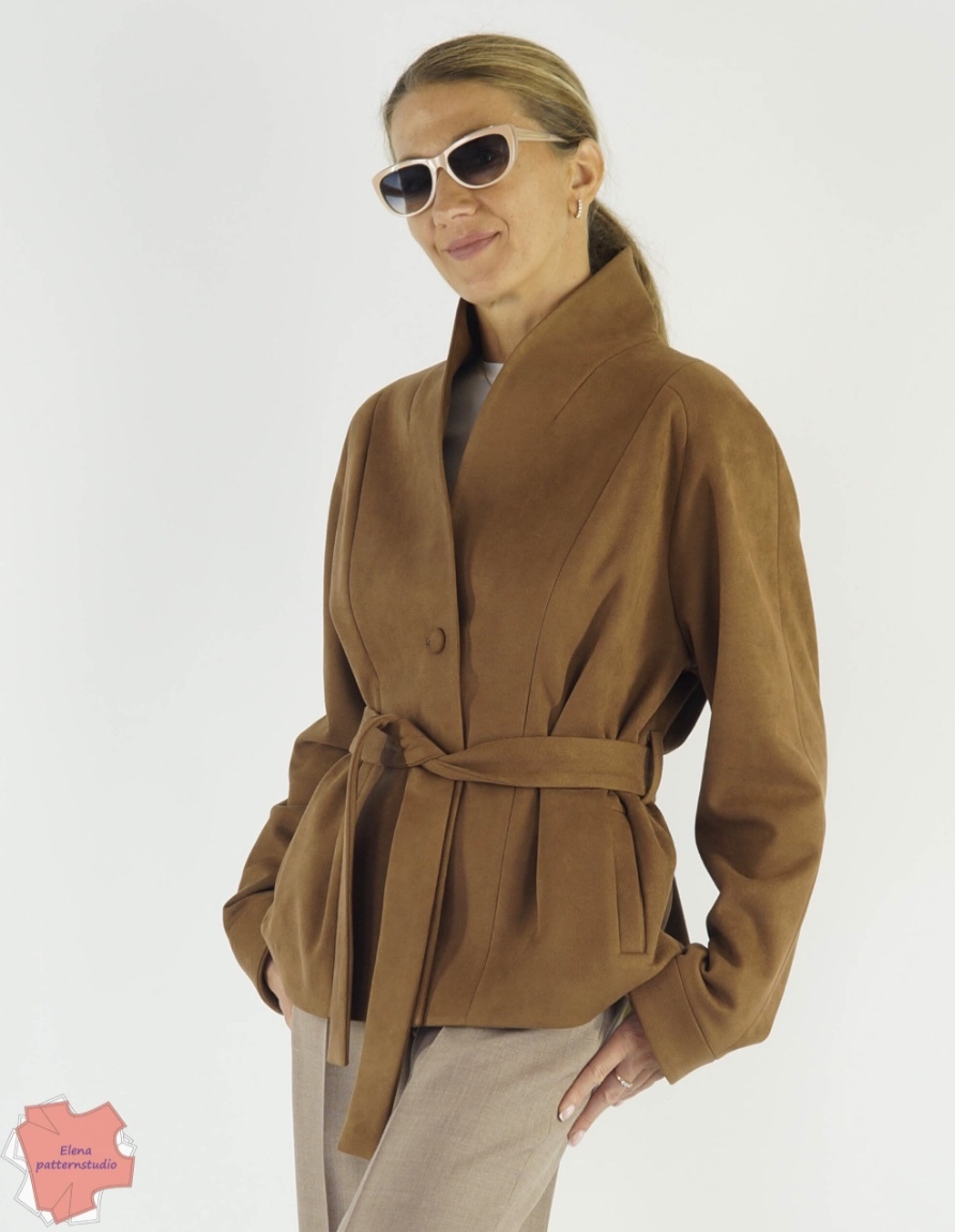 Выкройка куртки умеренного объема прямого силуэта. На полочках рельефные швы с нагрудными вытачками и прорезные карманы с листочками. На спинке рельефные швы с плечевыми вытачками. Рукава полуреглан, двухшовные. Низ рукава фигурный, оформлен манжетой. Воротник – цельнокроенная стойка, можно носить и в отложном виде. Застежка центральная на пуговицы и прорезные петли. Куртка на притачной подкладке. Длина изделия чуть ниже уровня бедер. Куртка дополнена съемным поясом, который фиксируется шлевками, настроченными на боковые швы.