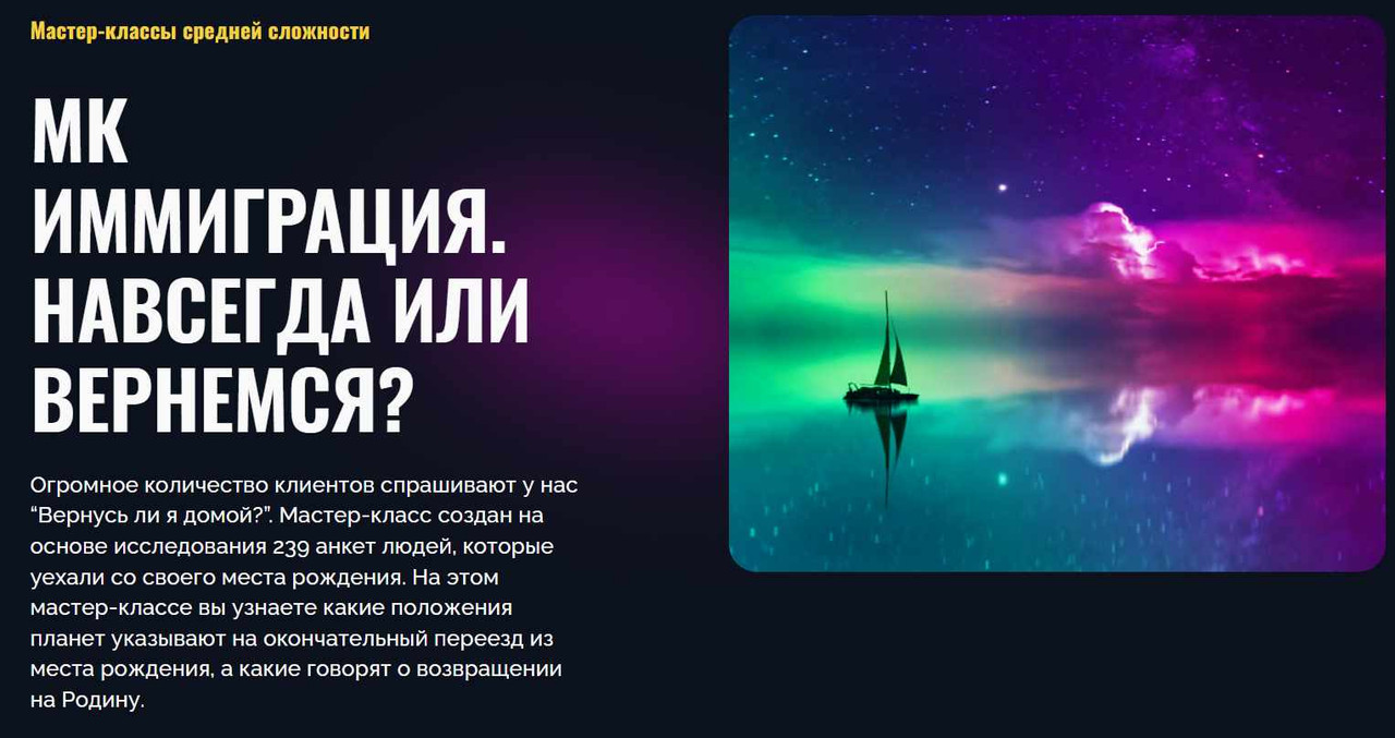Огромное количество клиентов спрашивают у нас “Вернусь ли я домой?”. Мастер-класс создан на основе исследования 239 анкет людей, которые уехали со своего места рождения. На этом мастер-классе вы узнаете какие положения планет указывают на окончательный переезд из места рождения, а какие говорят о возвращении на Родину.