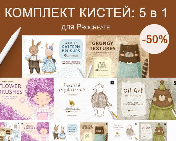 Этот комплект включает в себя 5 наборов кистей для Procreate. Каждый набор содержит в себе уникальные авторские кисти, которые подойдут как для профессионалов так и для начинающих иллюстраторов.