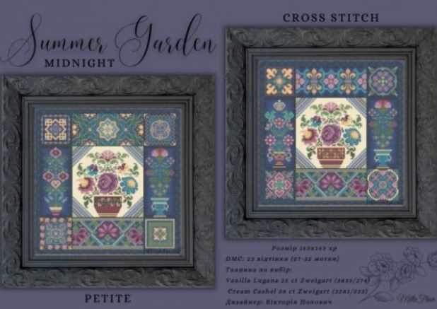 Образец летнего сада «Midnight», варианты вышивки крестиком и миниатюрных моделей. Данная схема входит в серию схем «Летний сад», которая имеет 4 цветовые схемы: