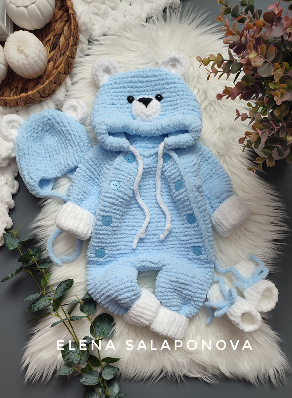 Комплект для малыша в размере 0-3 месяца (на рост 56-62см) из плюшевой пряжи