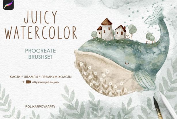 - 5 акварельных холстов в двух размерах: стандарт: 3200x4300 пикселей, большой: 4900x6300 пикселей 300 dpi sRGB (файлы, заканчивающиеся на .procreate.)