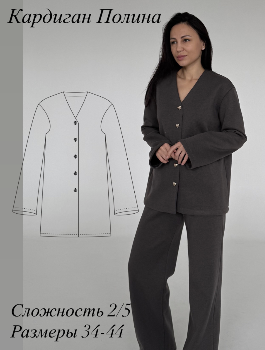 Выкройка кардигана умеренного объема, прямого силуэта. Рукав втачной, длинный. Линия плеча спущена. Вырез горловины V-образный, застежка однобортная на пуговицы и обметанные петли. Длина кардигана чуть ниже середины бедра.