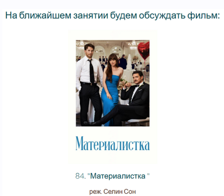 На ближайшем занятии будем обсуждать фильм: Материалистика.