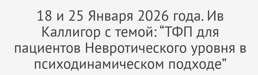 18 и 25 Января 2026 года. Ив Каллигор с темой: “ТФП для пациентов Невротического уровня в психодинамическом подходе”
