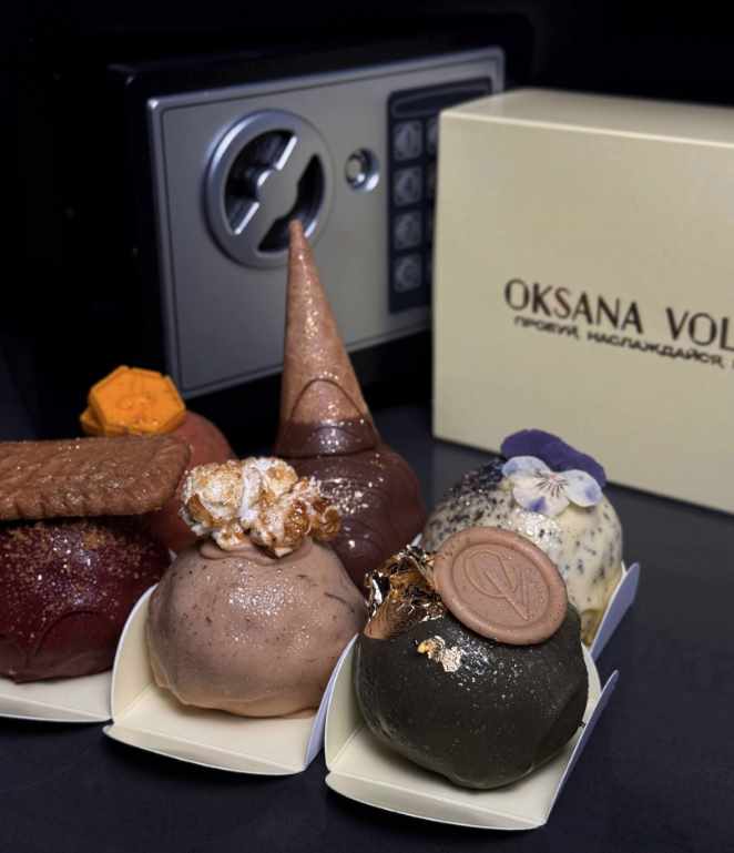 - "Хруст Попкорна" — воздушный бисквит на сиропе попкорна, карамельная начинка и крем, пропитанный ароматом карамельного киносеанса. Каждая ложка — как сцена из фильма, в котором хэппи-энд обязателен.