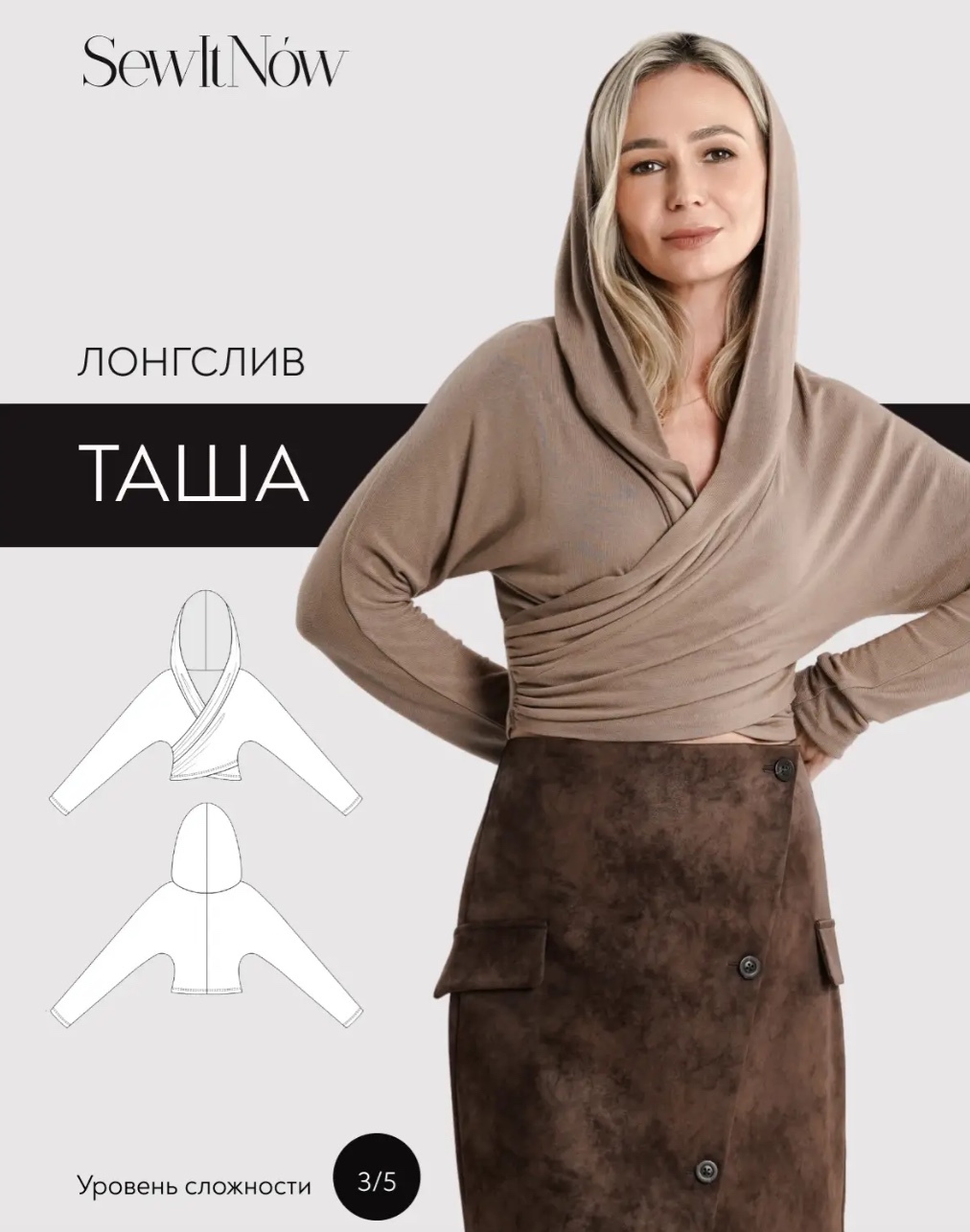 Лонгслив с двойным капюшоном, переходящим в деталь переда. Перед на запАх, с ассиметричной линией низа и сборкой в боковом шве. Спинка со средним швом. Рукав цельнокроеный.