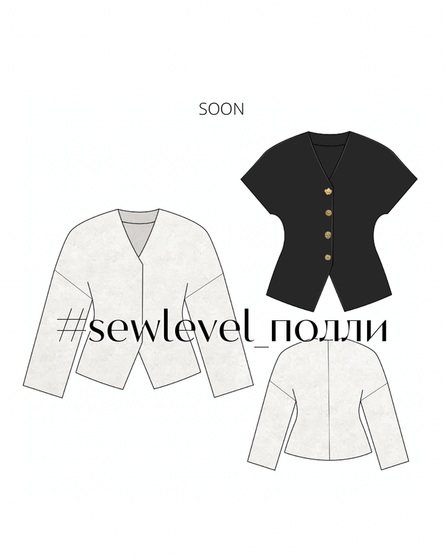 Приталенный крой. Плечо спущено. Для варианта жилетки предусмотрена обработка проймы обтачкой из основной ткани. В комплект входит дополнительная деталь длинного рукава, по низу рукава припуск на подгибку.
