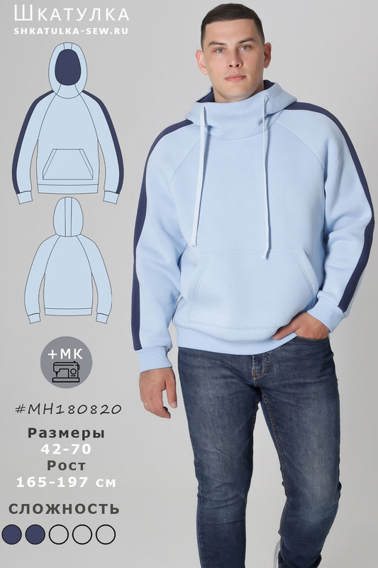 Выкройка мужской трикотажной толстовки умеренного объёма, прямого силуэта. Перед цельный, с накладным карманом «кенгуру». Спинка — цельная, без особенностей. Рукава покроя реглан, с контрастной вертикальной вставкой-лампасом, длинные, на притачной манжете по низу. Горловина изделия обработана капюшоном, выполненным на подкладке. Низ толстовки обработан притачным трикотажным поясом. Длина толстовки — до линии бёдер.