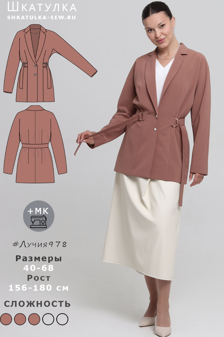 Выкройка женского жакета большого объёма, прямого силуэта, выполненного на подкладке. Перед - с талиевыми вытачками, с втачным поясом с полукольцами, расположенным в области талии. Спинка - со средним швом. Горловина жакета оформлена воротником английского типа с отложными лацканами. Застёжка - центральная, бортовая, на 2 обмётанных петли и пуговицы.