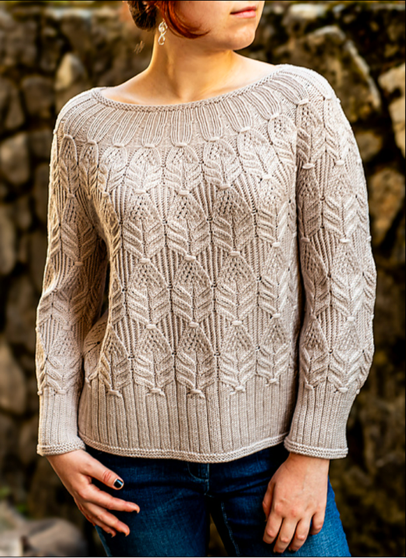 Вязаный сверху вниз из мягчайшей мериносовой шерсти, свитер FAYNA отличается нежным волнистым узором, который проходит по корпусу и рукавам, напоминая разворачивающиеся листья или листья папоротника. Сложная текстура прекрасно сочетается с чёткими краями: простая резинка лицевыми и изнаночными петлями на горловине, манжетах и подоле придаёт модели сбалансированность и практичность. Для разнообразия узор также дополнен изящным кружевом.