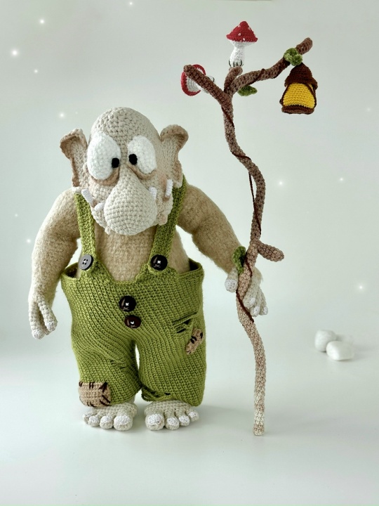 Дополнит весь образ тролля его любимая ветка, на которой висят яркий фонарь и парочка мухоморов. На этих волшебных страницах, я очень постаралась детально описать схему вязания тела тролля и его одежды.