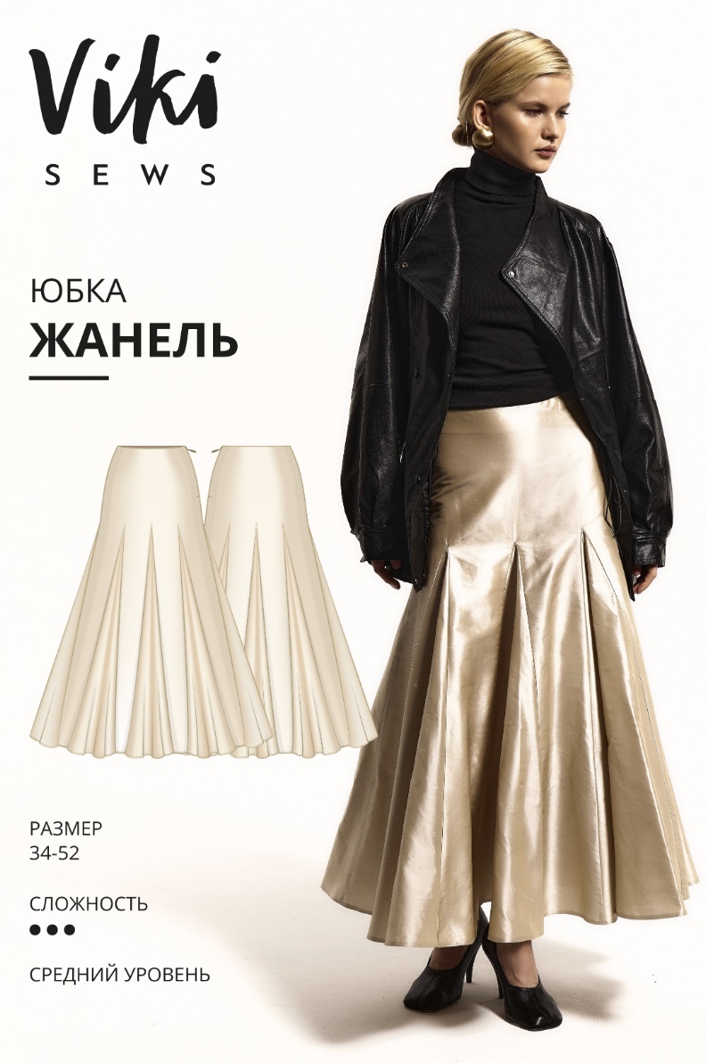 Выкройка юбки конической формы, большого объема, расширенного книзу за счет клиньев. Юбка без пояса, на обтачке. Посадка ниже уровня талии. В левом боковом шве застежка на потайную молнию. Длина юбки выше щиколотки.