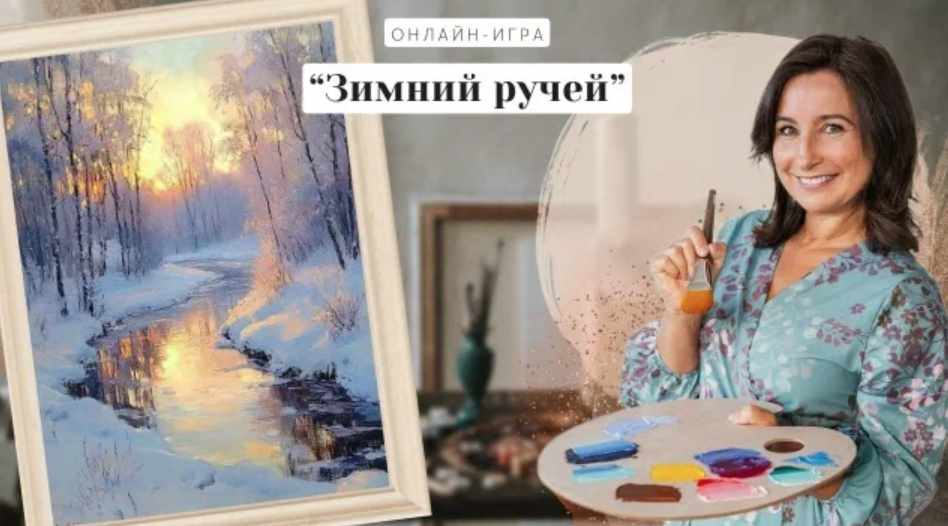 Именно такую картину мы создадим вместе на новой онлайн-игре «Зимний ручей». Вы познакомитесь с техникой передачи световых переходов, научитесь писать отражения на воде и создавать воздушную зиму